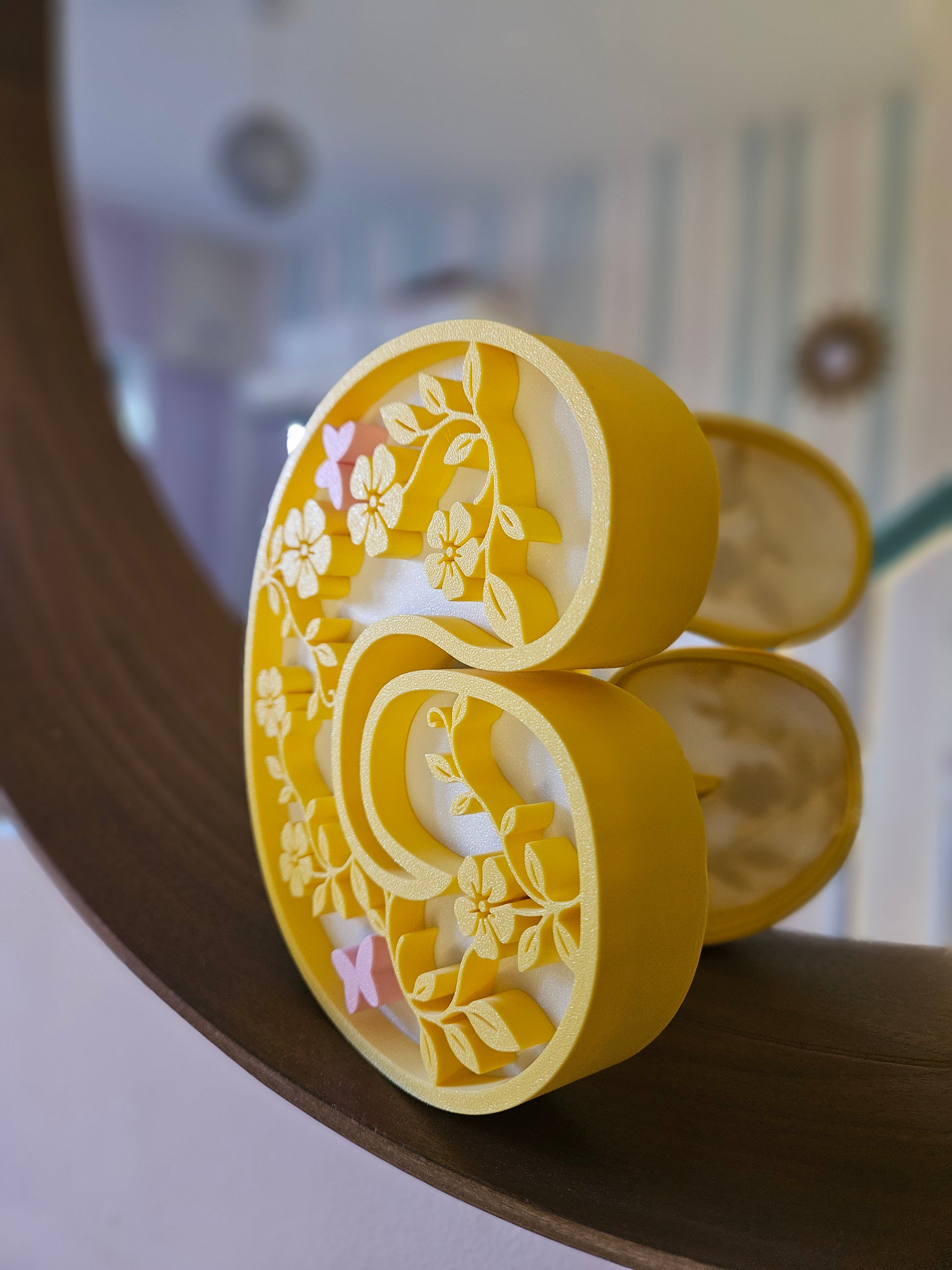 Add a cheerful and enchanting focal point to your little one’s bedroom or nursery with this beautifully crafted 3D decorative letter. Featuring a vibrant frame, this piece comes to life with intricate, layered cutouts of climbing vines, blooming flowers, and delicate butterflies. Designed to stand perfectly on a bookshelf, nightstand, or dresser, it’s a wonderful way to celebrate their initial and add a magical, whimsical vibe to their room.