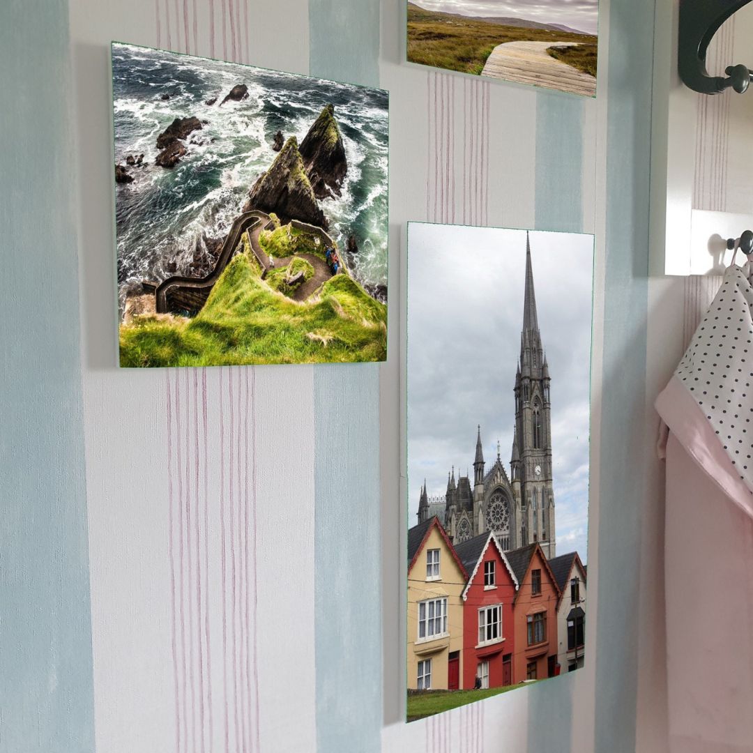 Larger framed Photo Tiles include the Nano Gel pad hanging system. Smaller, lighter ones feature the magnetic fixing system. Visit product pages for specific details.